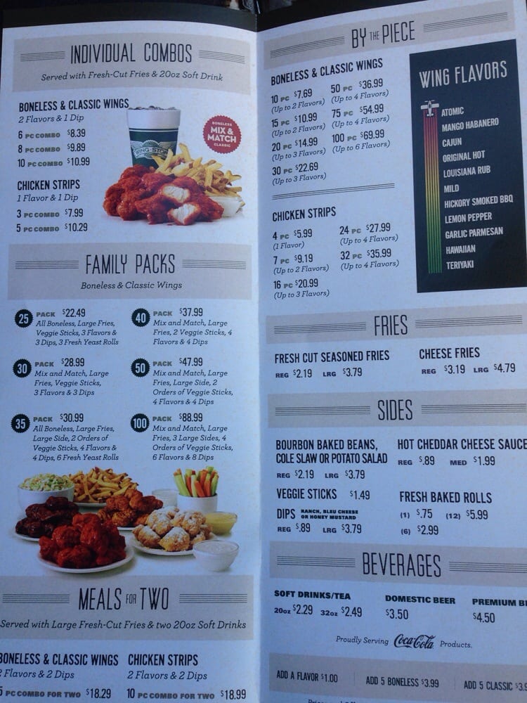 Comes with 20 Boneless Wings in your choice of 4 flavors, with a large fry and 2 dips. (Feeds 2-3)